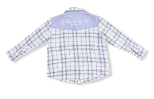 • Angel Dear - Blue Plaid - L/S Western Pearl Snap Shirt w/ Howdy Embroidery on Back