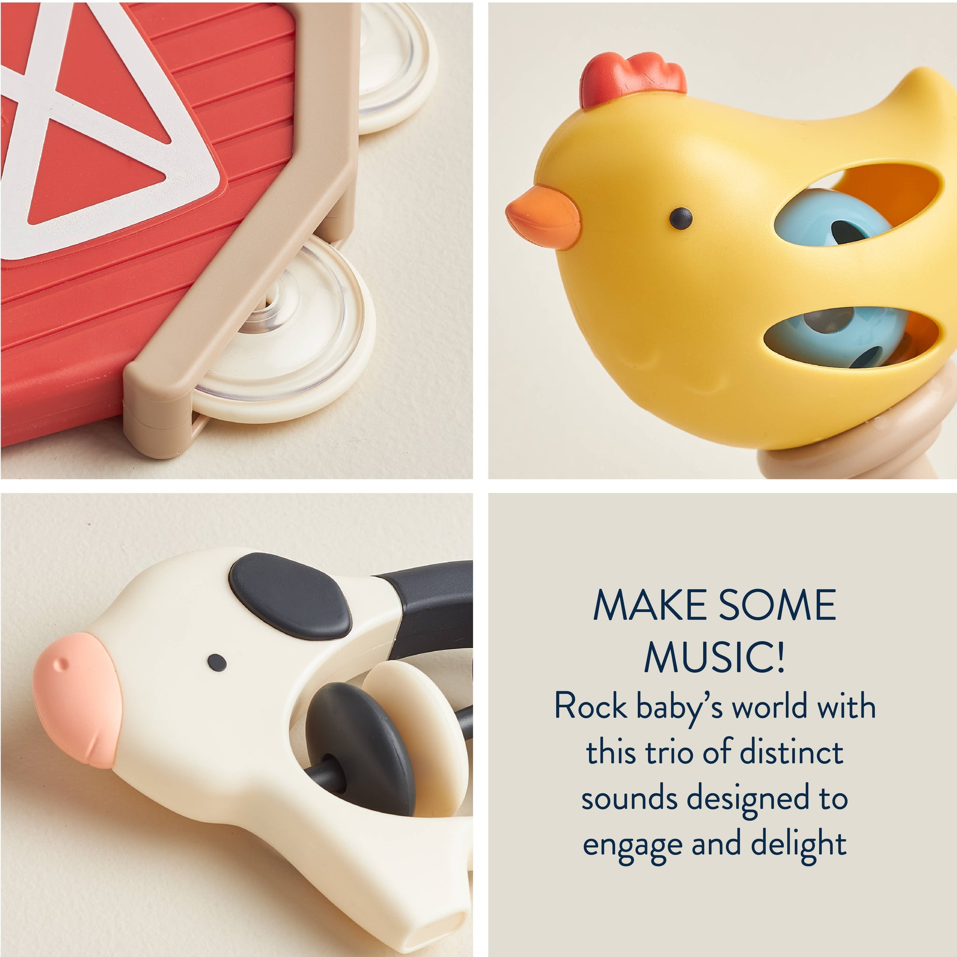 Make some music! Rock baby’s world with the Itzy Bitzy Jamboree music set. Designed for little hands to hold, this toe-tapping trio features a tambourine, jingle maraca, and shaker toy with clacker beads for an all-out sensory jam sesh.