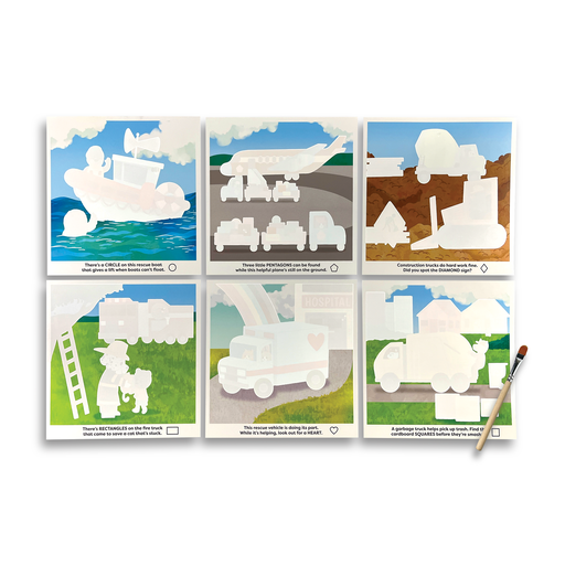 "Your fire and police truck loving kiddo will adore this Water Amaze water reveal book! Jam packed with 12 reusable reveal boards, each picture features a sweet illustration of a helpful vehicle. Accompanying every image is a charming rhyme that encourages your child to learn about shape