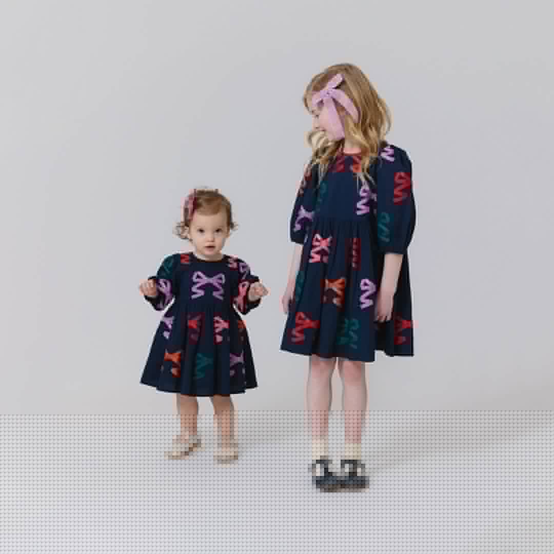 Fun And Festive! A colorful mix of grosgrain ribbon bows pop against a solid navy ground in our not-just-for-parties Girls Brooke Dress. Classic design elements include a rounded neck, full skirt twirl-worthy skirt, 3/4 puff sleeve and silver glitter buttons at the back. Twin with baby sis in our Baby Girls Brooke Dress Set.
