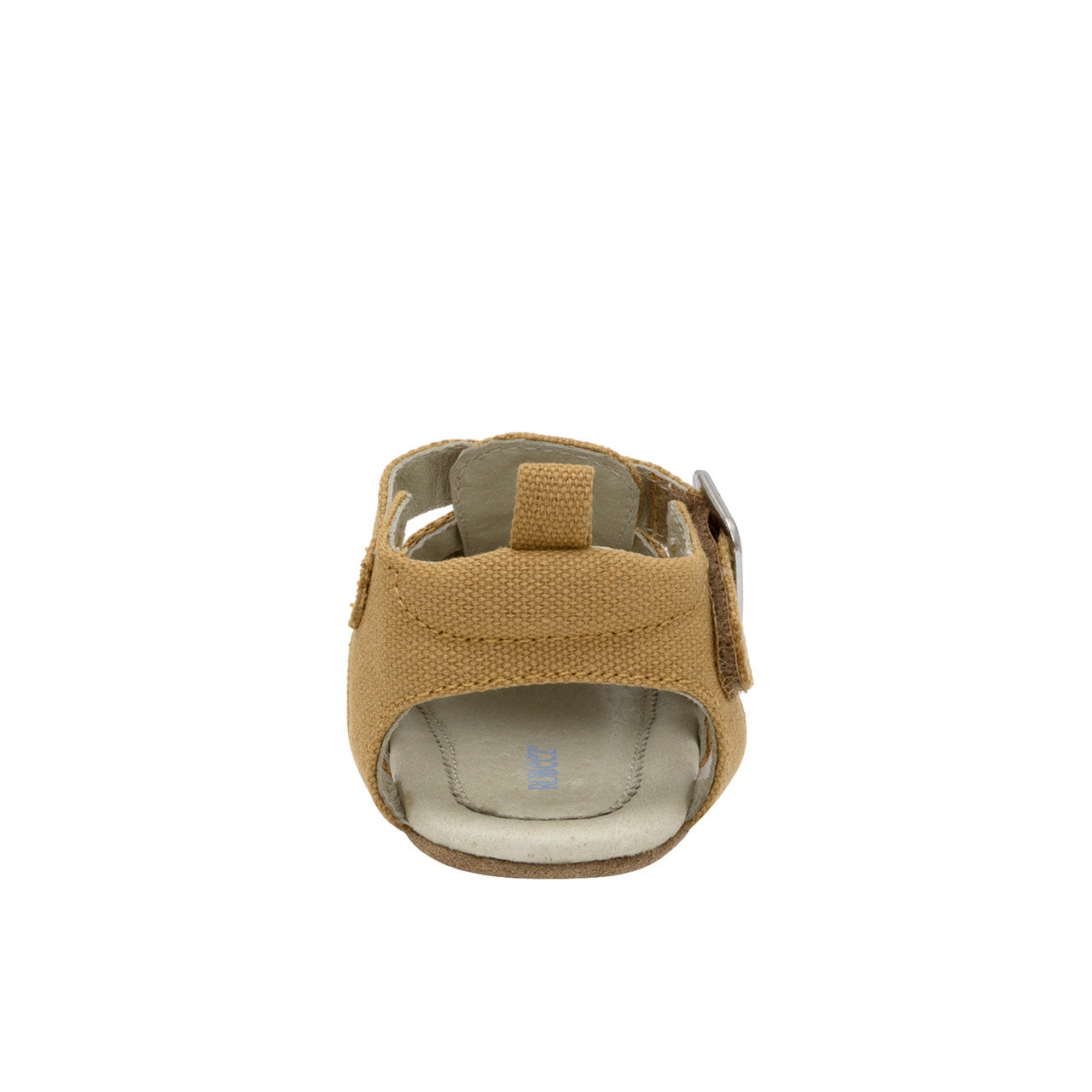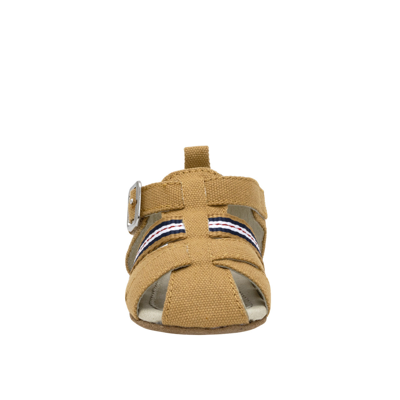 Tiny feet, big style. Introducing the Stuart First Kicks in Tan - the canvas sandals designed to keep up with your active, adventurous child. Designed as fisherman sandal silhouette with supportive rubber and suede sole. Crafted from premium tan canvas, these sandals offer breathability and a timeless aesthetic that complements any little ones outfit. The adjustable Velcro straps allow you to get the perfect fit as your little one's feet grow, while the supportive sole provides the stability they need to tackle every playground, park, and family outing with confidence.