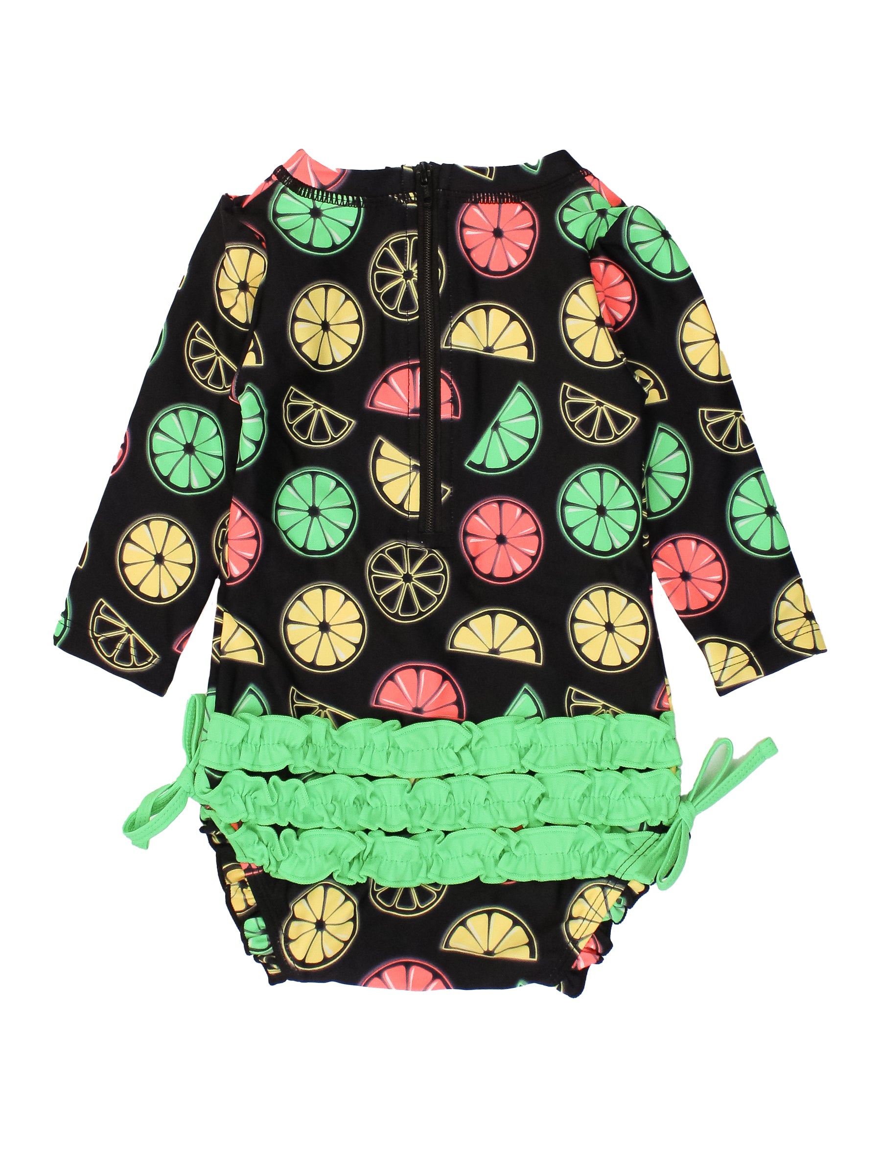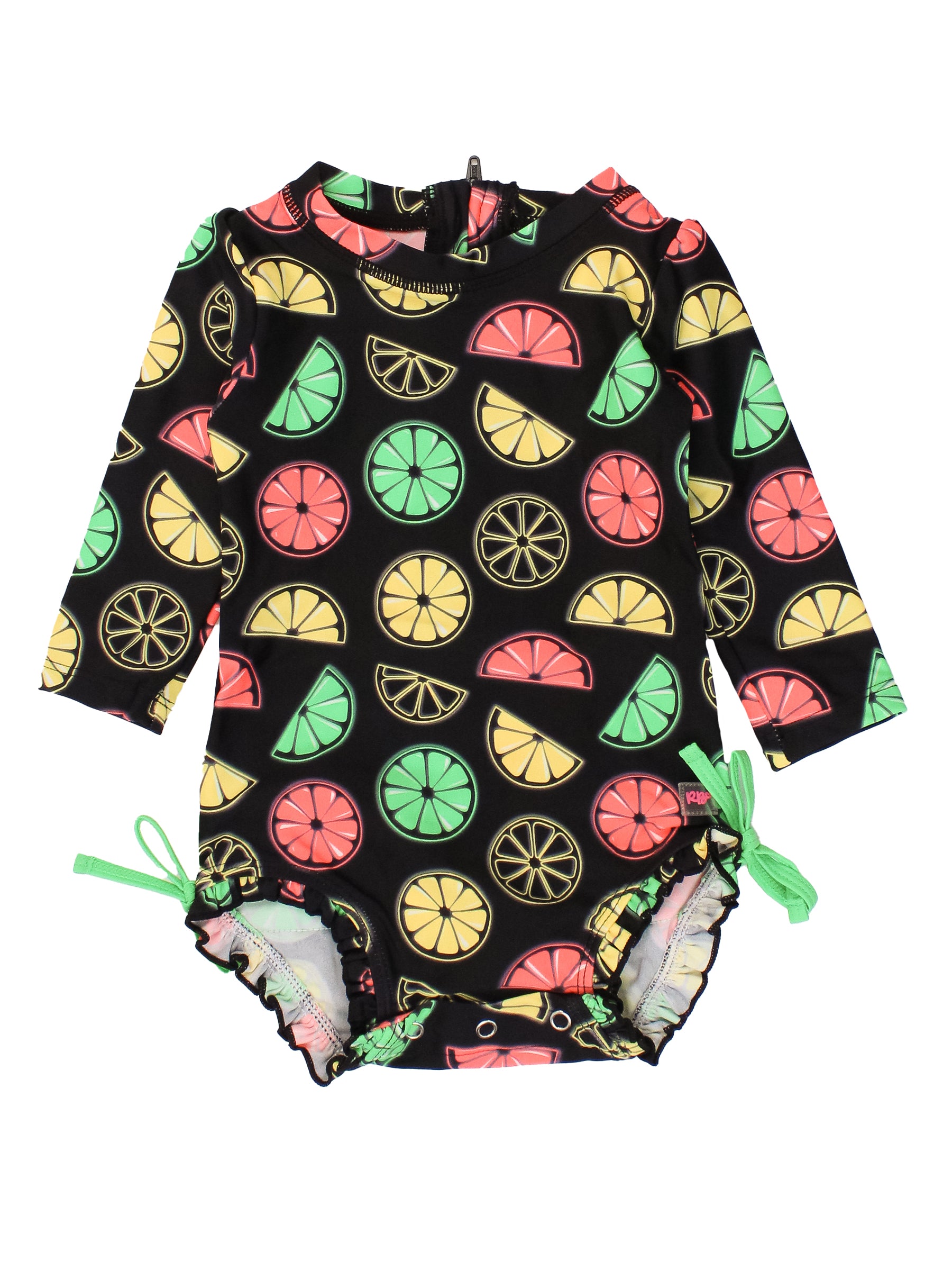 Rufflebutts - Neon Black Citrus Long Sleeve One Piece Rash Guard