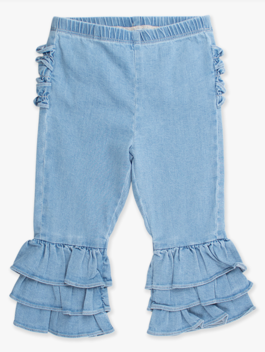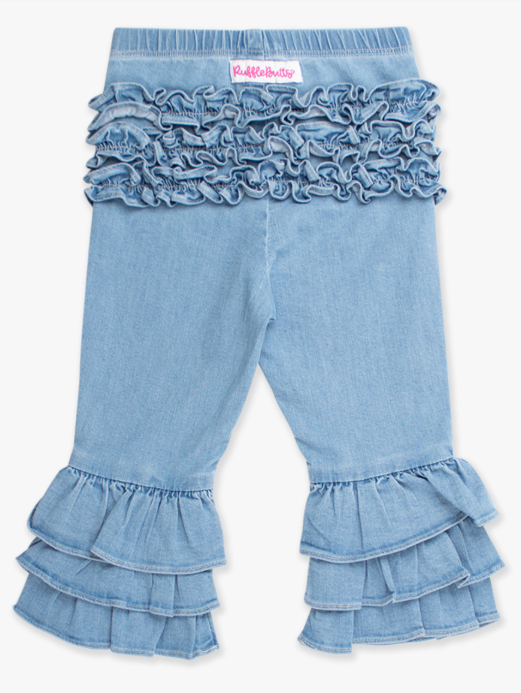 The light wash denim makes it easy to coordinate and create a beautiful outfit. Due to the unique nature of denim, color variations may occur between batches. We consider this part of its charm, and is not a defect. These denim ruffle flare jeans are too cute to pass up! 3 full tiers of ruffles at the ankle make these a statement piece that any little girl will love to wear. Premium denim fabric stands up to everyday wear. Signature rear ruffles add a girly touch!