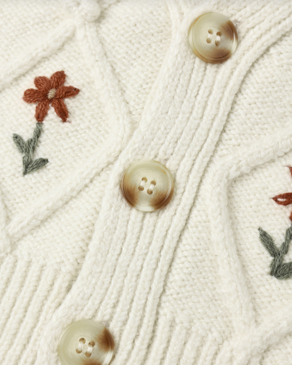 Cardigan: Made of 100% polyester. Appliqué: Made of 100% cotton.
