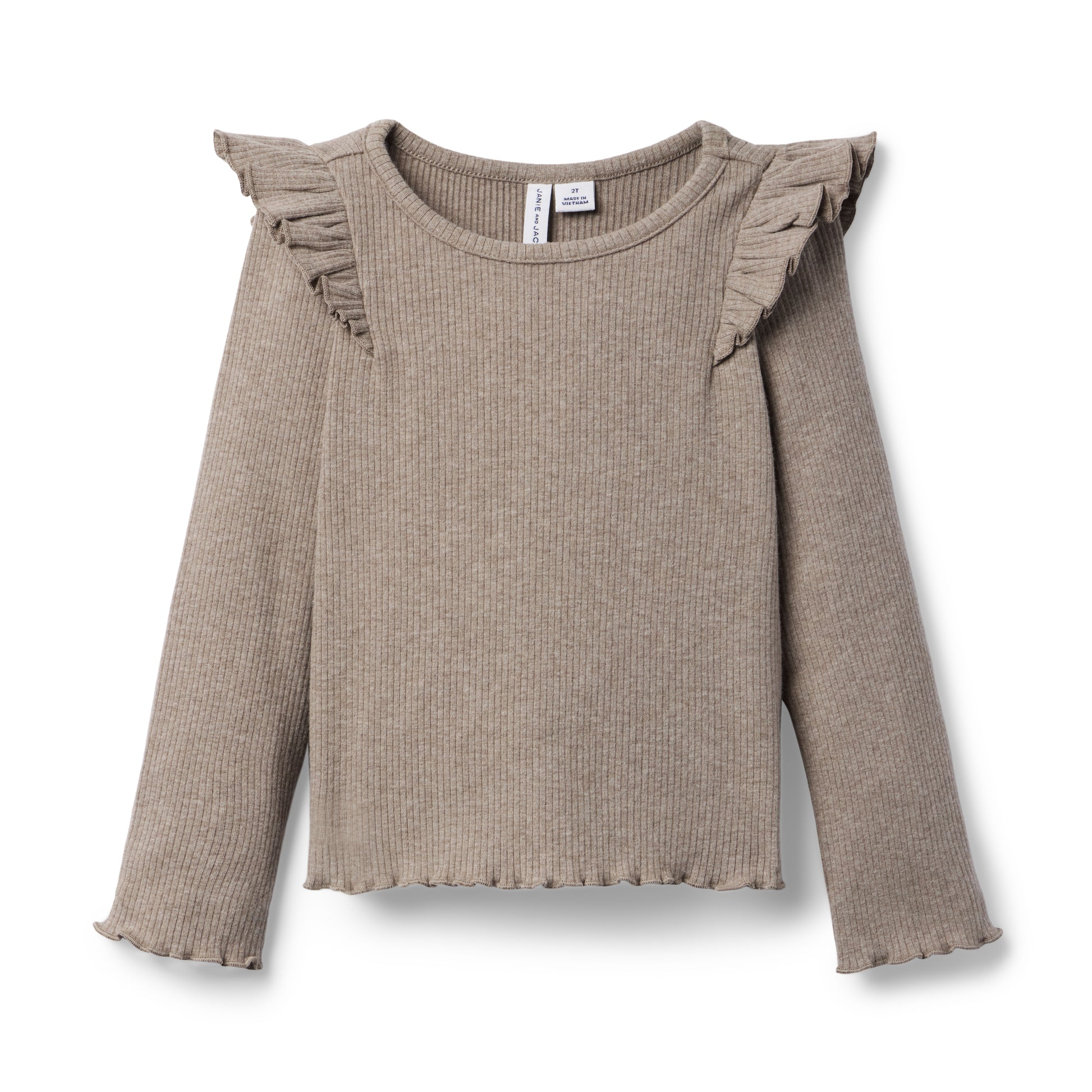 All the frills for this top favorite. In cozy brushed rib with ruffles at the shoulder, cuff and hem.