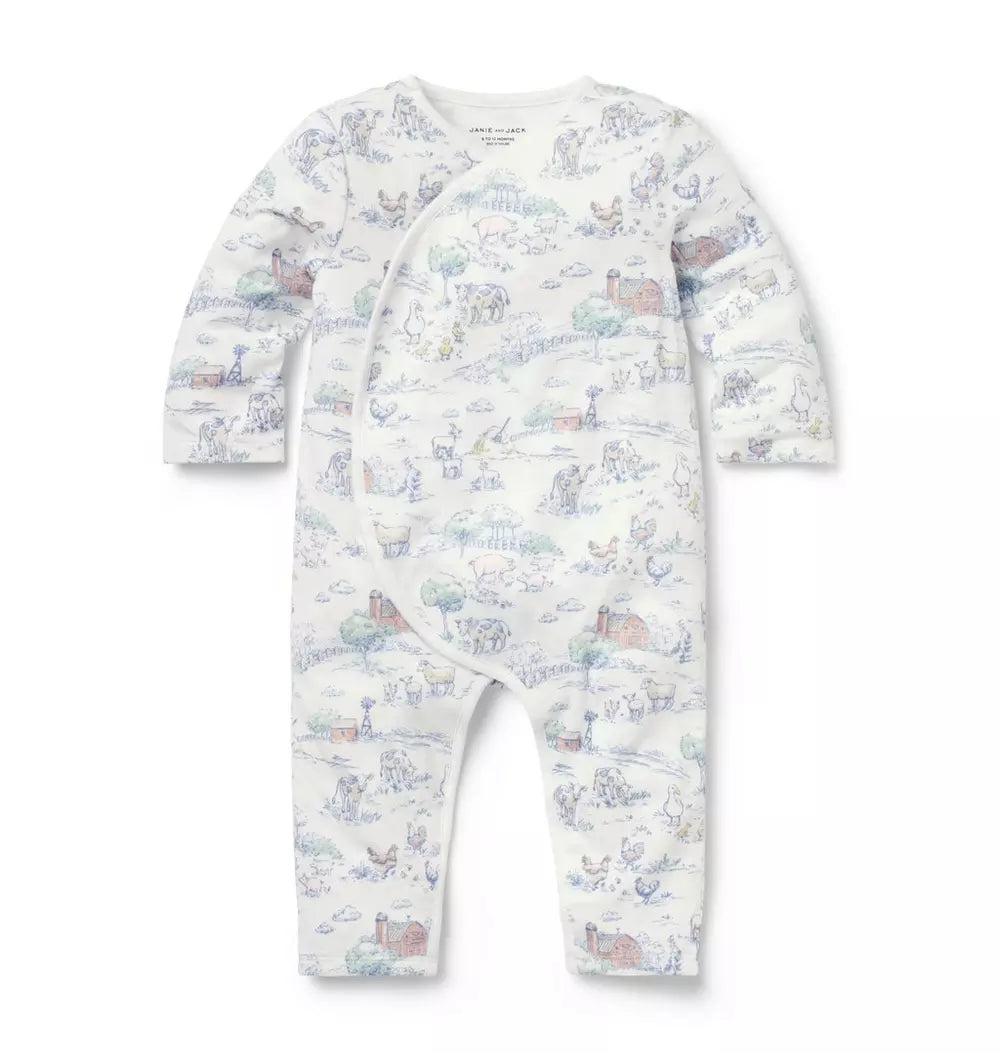 For all of baby's first moments, our farm animal toile one-piece is the perfect choice. Featuring a kimono-inspired wrap silhouette and a little back pocket, just because.