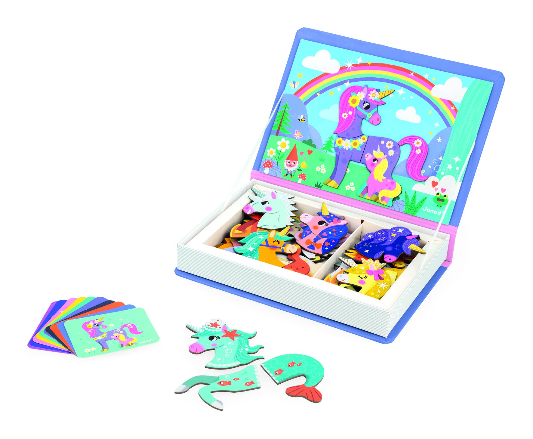 Welcome to the fantastic and enchanting world of unicorns! This magnetic toy comprises 44 magnets and 10 cards. The aim is to recreate beautiful unicorns. Each with its own personality and environment. One example being that the sea unicorn boasts a long fish-like fin to help it move through water. This magnetic toy helps children recreate magical animals, whilst also developing their imagination. They can even get more creative and invent their own unicorns by mixing up the magnets. Little ones are bound to come up with wonderful stories! Cardboard magnetic toy. Educational toy for children aged 3 years and up.