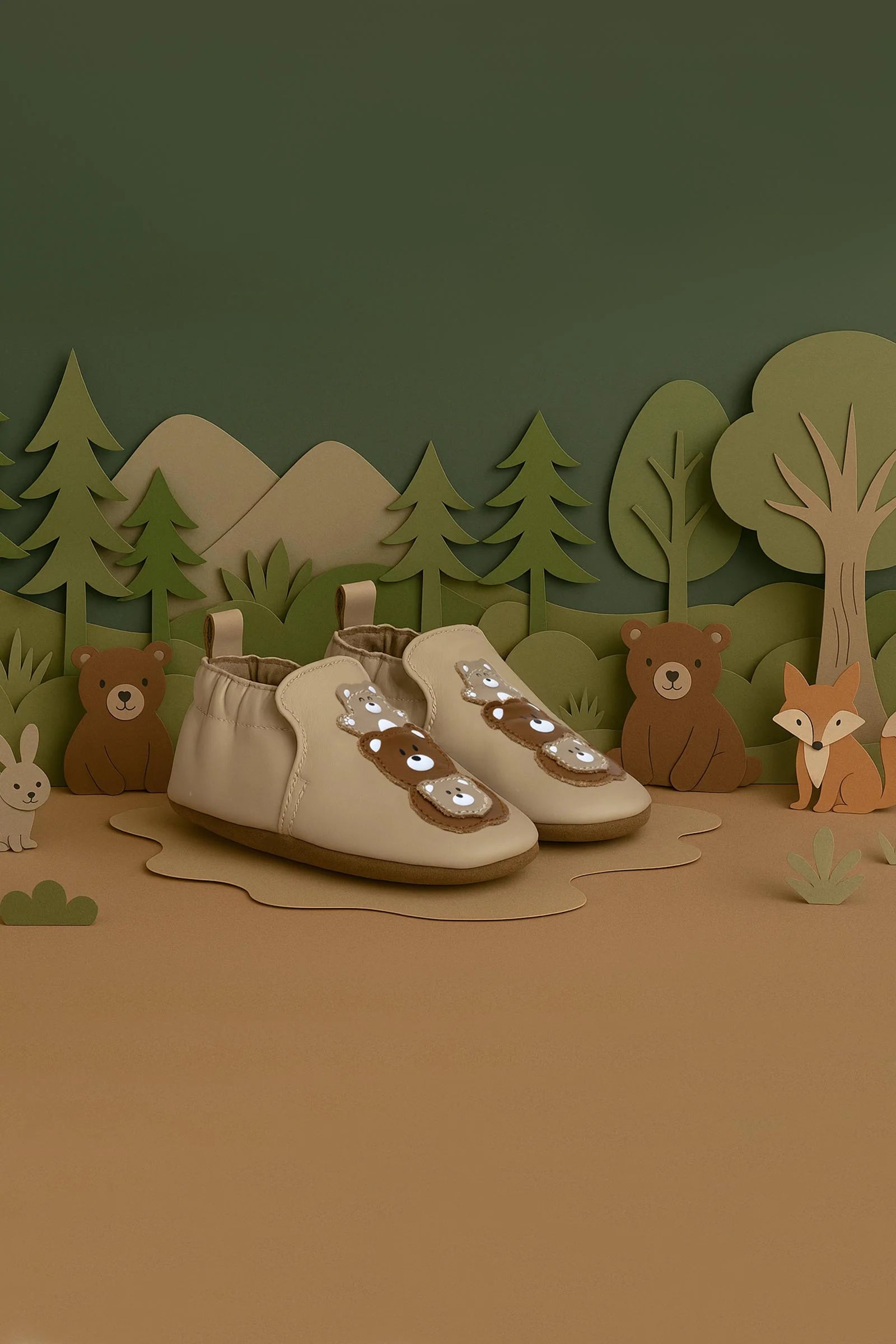 Snuggle up with the Bear Hugs Soft Soles in Tan, decorated with three cuddly bears sharing a hug. The soft tan tone pairs perfectly with the sweet design, while the suede outsole offers gentle grip and comfort for your little one's first steps.